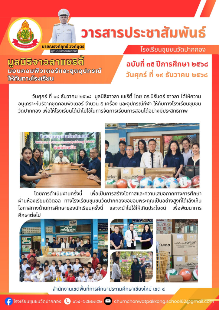 On Friday, December 19, 2025, representatives from the Chawla Charity Foundation visited Chumchonwatpakkong School in Chiang Mai to donate computer equipment and sports gear to 132 students, ranging from kindergarten to Grade 12. The group included 40 kindergarten students and 92 primary-level students, warmly supported by 12 dedicated teachers who welcomed the team and provided close guidance throughout the visit. The donated items included five complete computer sets and six types of sports equipment: volleyballs, footballs, share balls, a volleyball net, share ball baskets, and basketballs. These contributions were intended to support long-term learning and skill-building activities for the students.