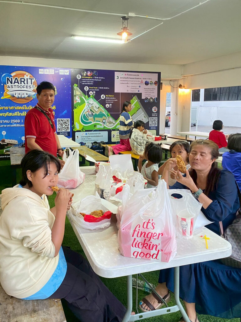 หลังจากการเดินทางท่ามกลางดวงดาว มื้อเย็นแสนเรียบง่ายแต่เต็มไปด้วยรอยยิ้มก็รออยู่ เด็ก ๆ ได้นั่งล้อมวง รับประทาน KFC มื้อพิเศษ ด้วยเสียงหัวเราะและความสุขเล็ก ๆ ที่จับต้องได้ สำหรับใครหลายคน มื้อนี้ไม่ใช่แค่อาหาร แต่คือช่วงเวลาแห่งความอบอุ่น การแบ่งปัน และความรู้สึกว่าตนเองมีคุณค่า